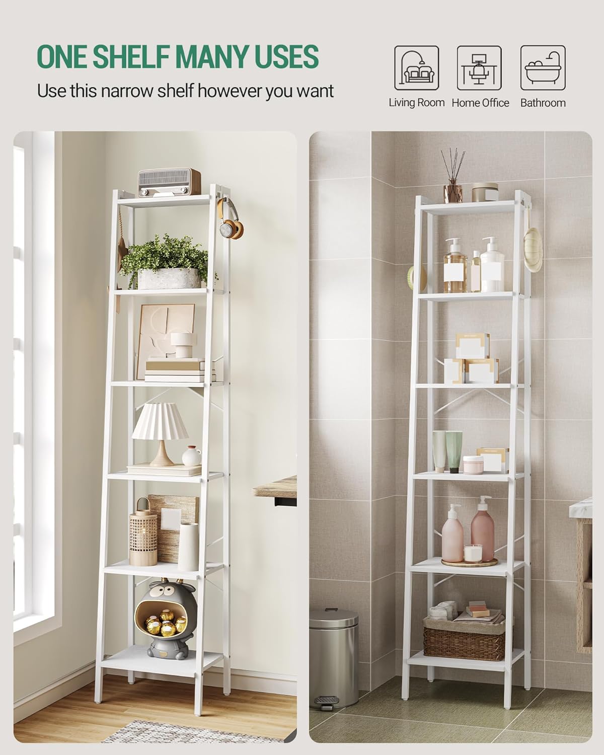 Introducing the versatile and stylish 6-Tier White Ladder Shelf Bookcase – the perfect addition to any home or office space. This freestanding corner storage shelf features a sleek industrial design that effortlessly blends with any decor, adding a touch of modern elegance to your living room, kitchen, bedroom, or office.