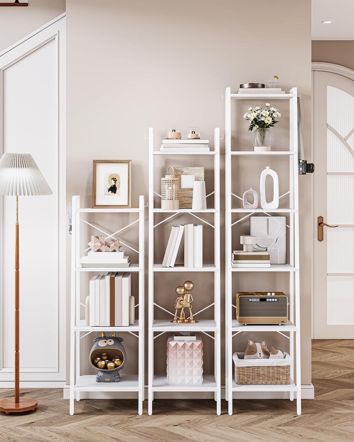 Crafted with durability and functionality in mind, this bookshelf bookcase is designed with 6 spacious shelves to provide ample storage and display space for your favorite books, plants, photo frames, and other decorative items. The two hooks included on the side offer convenient hanging storage for keys, bags, or accessories, keeping your space organized and clutter-free.