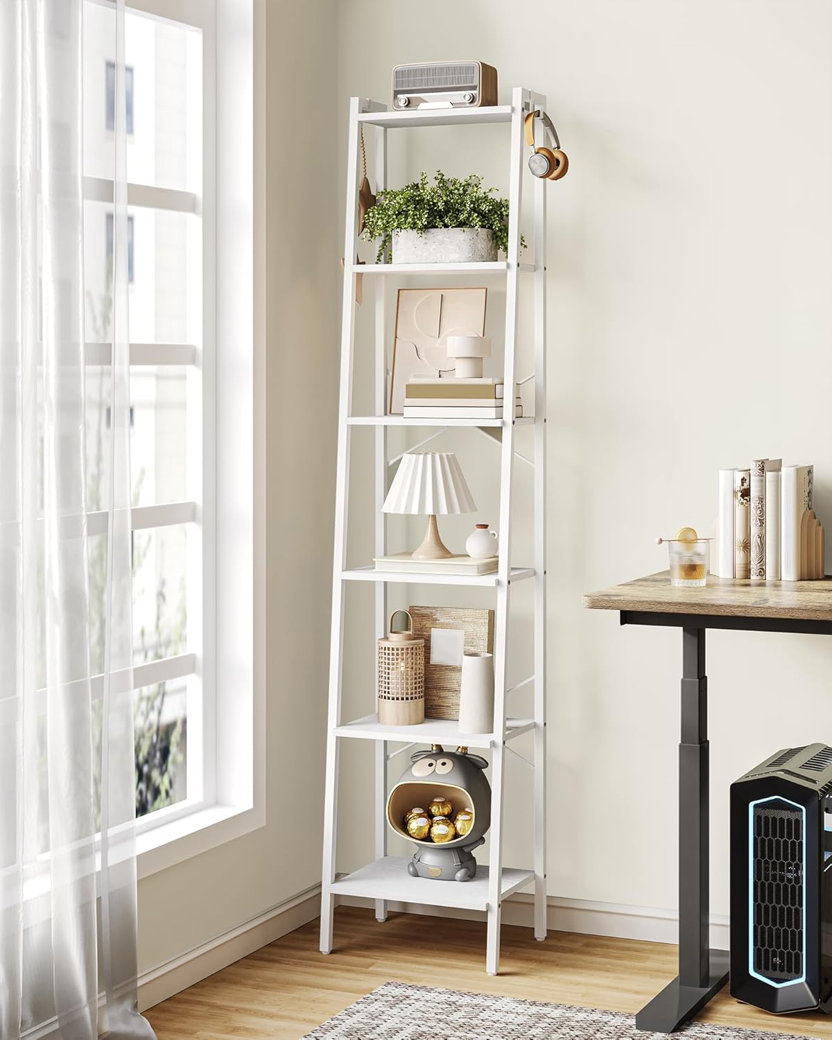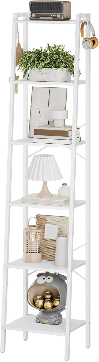 Ladder Shelf, Bookshelf Bookcase, Freestanding Corner Storage Shelve with 2 Hooks for Home Office, Living Room, Kitchen, Bedroom, Industrial, 6-Tier White BC13313W